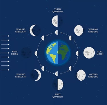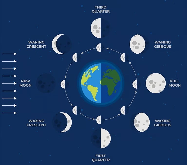 Καθώς η Νέα Σελήνη φωτίζεται, περνά μέσα από μια Ημισέληνο, μετά ένα Τέταρτο, ακολουθούμενη από το στάδιο Gibbous. Τέλος, φτάνει στην Πανσέληνο και στη συνέχεια η σκιά αρχίζει να σέρνεται από την άλλη πλευρά. Ο κύκλος επαναλαμβάνεται αντίστροφα – Gibbous, Τέταρτο, Ημισέληνος – μέχρι να έχουμε ξανά Νέα Σελήνη.